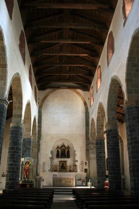 Tuttavia lo spazio rimasto riesce ugualmente ad animarsi e ad affascinare con la fuga degli archi ogivali, ghierati dai conci di pietra arenaria gialla, sostenuti da due file di brune colonne in pietra lavica, alternativamente rotonde ed esagonali, che, insieme agli archi sovrastanti, si fondono anche nelle alte capriate lignee del soffitto che in qualche parte e nelle mensole a truciolo che sorreggono le travi conservano ancora tracce dell’antica decorazione. Completano le linee architettoniche dell’interno i filari delle finestre ad arco acuto che si aprono, a strombatura, nel profondo spessore dei muri dell’alta navata centrale e di quelle laterali rosseggiando sul bianco intonaco delle pareti del tempio per il cotto che ne riveste le superfici interne e gli estradossi. Il tutto crea un’avvolgente atmosfera di religioso silenzio e, ad un tempo, di arcano linguaggio che sembra provenire da tempi lontani.